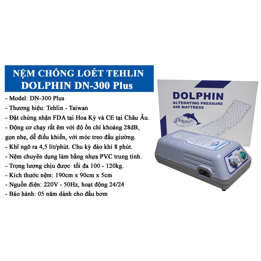 - Máy bơm của nệm sử dụng điện 220V - 50Hz với cục biến điện ở trong thân máy để đưa dòng điện vào motor chỉ còn 24V. Hơn nữa, phần nệm nối với máy bàng một ống dây đôi có chiều dài hơn 1 mét cho nên nệm rất an toàn cho người sử dụng. nệm chống loét dolphin dn 300plus